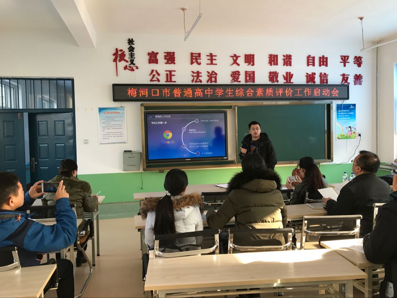 為落實(shí)吉林省教育廳《關(guān)于啟動(dòng)吉林省普通高中學(xué)生綜合素質(zhì)評(píng)價(jià)工作軟件安裝和平臺(tái)測(cè)試的通知》(吉教基二[2017]26號(hào))的文件精神,助力吉林省普通高中學(xué)生綜合素質(zhì)評(píng)價(jià)工作的順利開(kāi)展,吉林省慧??萍夹畔⒂邢薰居?1月24日,派出實(shí)施人員參加梅河口市普通高中學(xué)生綜合素質(zhì)評(píng)價(jià)工作啟動(dòng)會(huì)暨評(píng)價(jià)平臺(tái)使用培訓(xùn)會(huì),對(duì)與會(huì)人員進(jìn)行了應(yīng)用培訓(xùn)與技術(shù)指導(dǎo)。