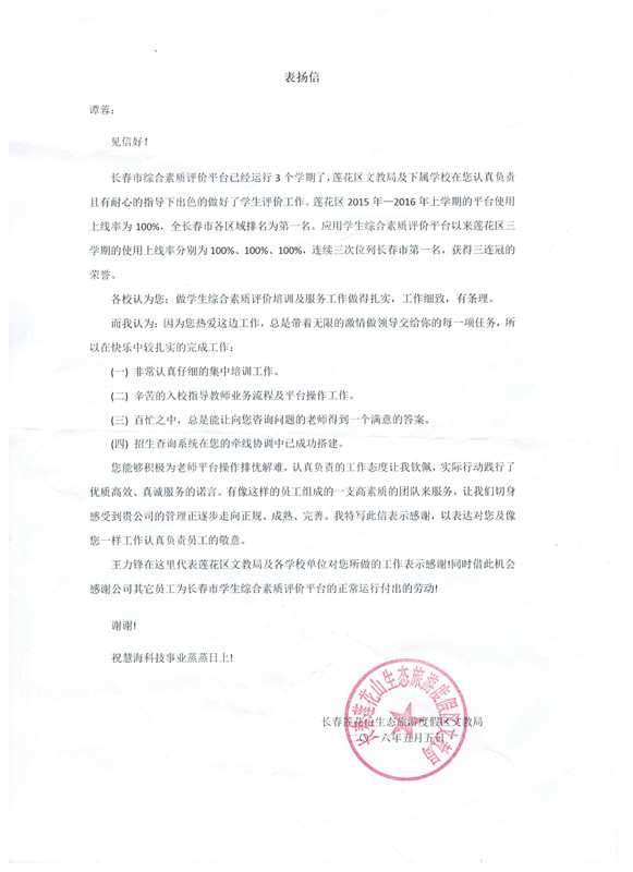 長春蓮花山生態(tài)旅游度假區(qū)文教局在給譚蓉的感謝信中表示,在使用學(xué)生綜合素質(zhì)評(píng)價(jià)平臺(tái)3個(gè)學(xué)期以來,蓮花區(qū)文教局及下屬學(xué)校在其指導(dǎo)下出色的做好了學(xué)生評(píng)價(jià)工作,蓮花區(qū)2015年—2016年上學(xué)期的綜合素質(zhì)評(píng)價(jià)平臺(tái)使用上線率100%,全長春市各區(qū)域排名第一。應(yīng)用學(xué)生綜合素質(zhì)評(píng)價(jià)平臺(tái)以來,蓮花區(qū)在使用上線率上連續(xù)三次位列長春市第一名,獲得三連冠的榮譽(yù)。