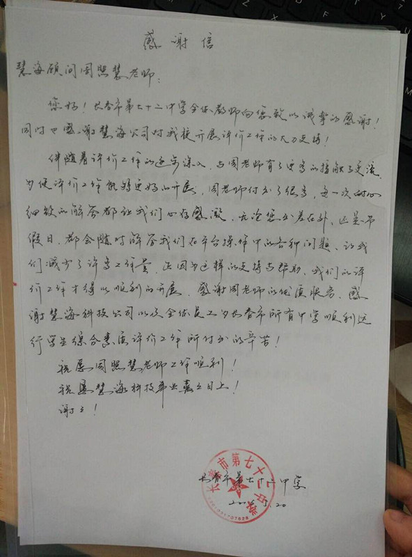 長春市第七十二中學(xué)感謝慧海科技全體員工為長春所有中學(xué)順利運(yùn)行學(xué)生綜合素質(zhì)評(píng)價(jià)工作所付出的辛苦。