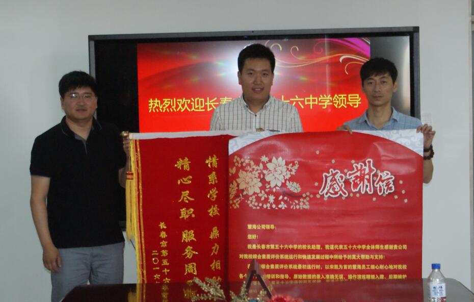 進(jìn)入驕陽似火的七月,我公司再傳喜訊。7月13日,長春市第五十六中學(xué)副校長柳鑫代表學(xué)校來到慧海科技,專程將感謝信與錦旗送到我公司,特別向我公司實(shí)施部員工宋凱對五十六中學(xué)素質(zhì)教育綜合評價(jià)系統(tǒng)運(yùn)行和快速發(fā)展過程中給予的幫助和支持表示感謝。